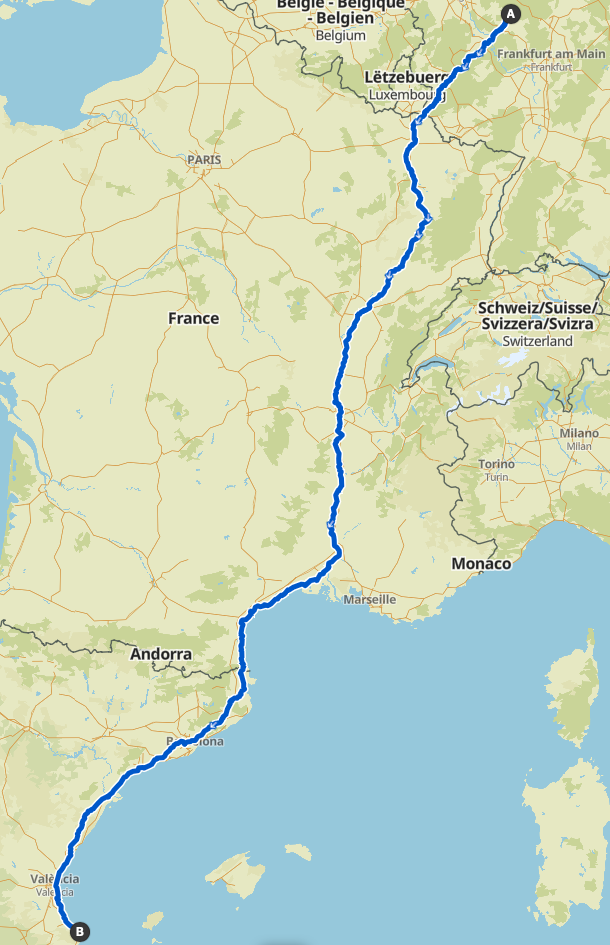 Uns erwarten etwa 2.100 km – und die Reise soll ab dem 4. September u. a. über Koblenz, Trier, Metz, Nancy, Lyon, Orleans, Sête, Perpignan, Barcelona, Tarragona und Valencia gehen.