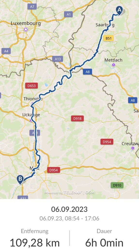 So – um ca. 17:30 Uhr am Hotel südlich von Metz nach knapp 110 km angekommen.
