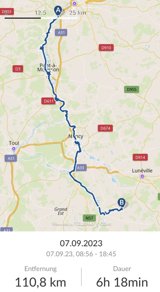 Endlich in Einaux bei Bayon angekommen. Die Suche nach einer passenden Unterkunft war recht schwierig. Nach 97 km mit nur 480 Höhenmetern fast immer unfallfrei auf dem Radweg ging es ausgerechnet am Schluss bei 31 Grad noch einmal tüchtig bergauf – wir mussten teilweise sogar die Räder schieben 🚴🏻♀️🚴🏻♀️
