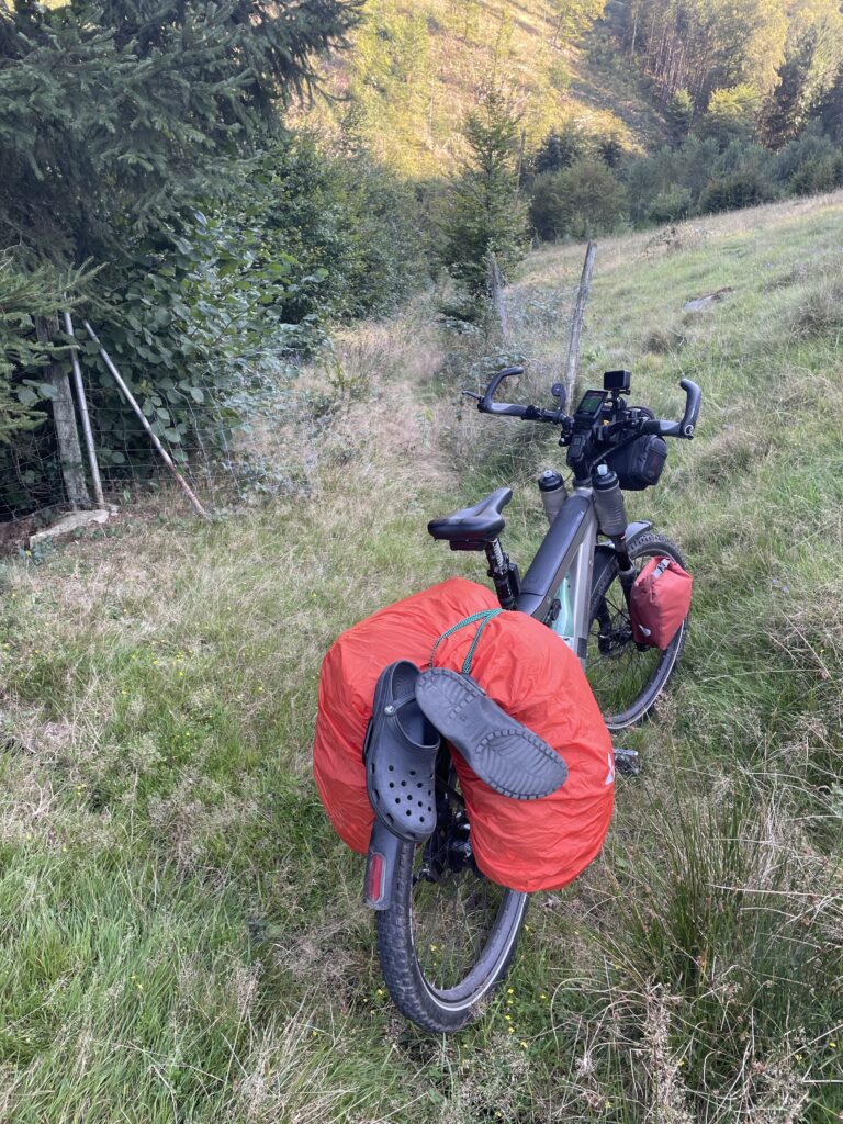 Nach Öffnen eines Weidegatters befanden mein Fahrrad und ich uns auf einer sehr (!) steilen Alm ohne zunächst erkennbaren Ausweg.