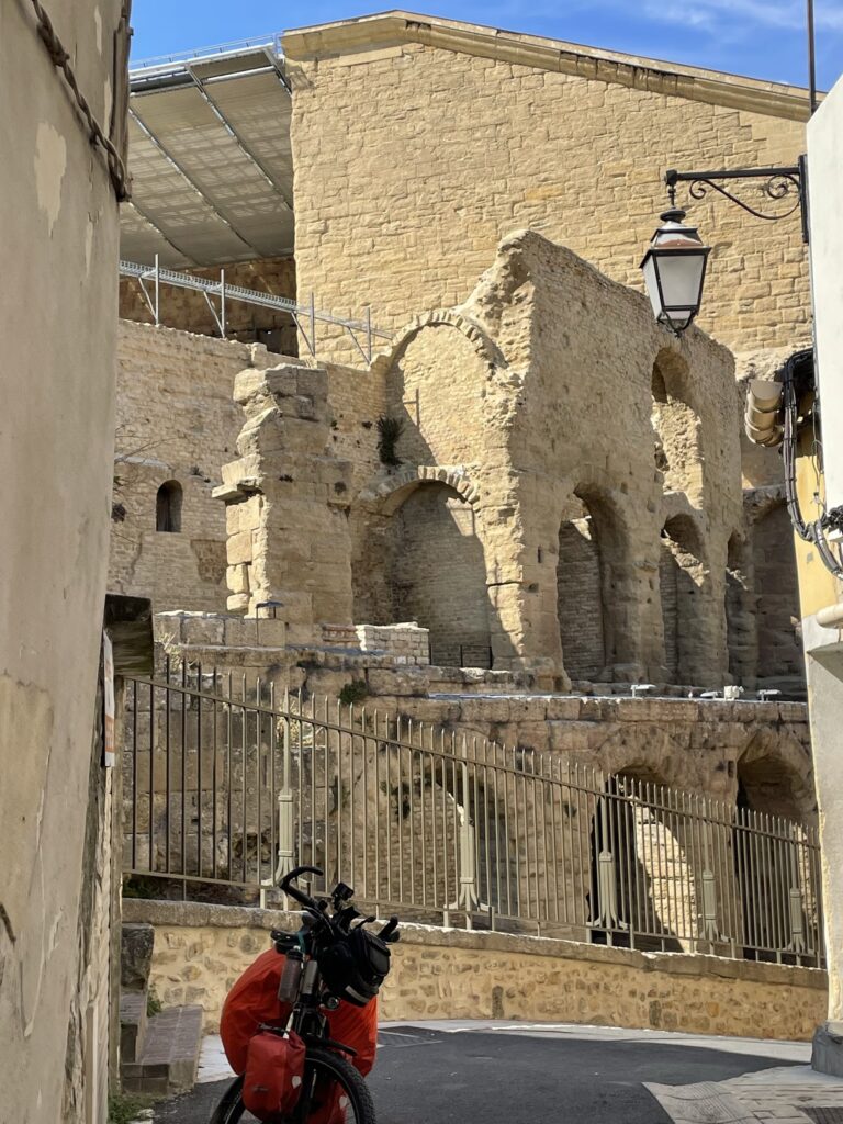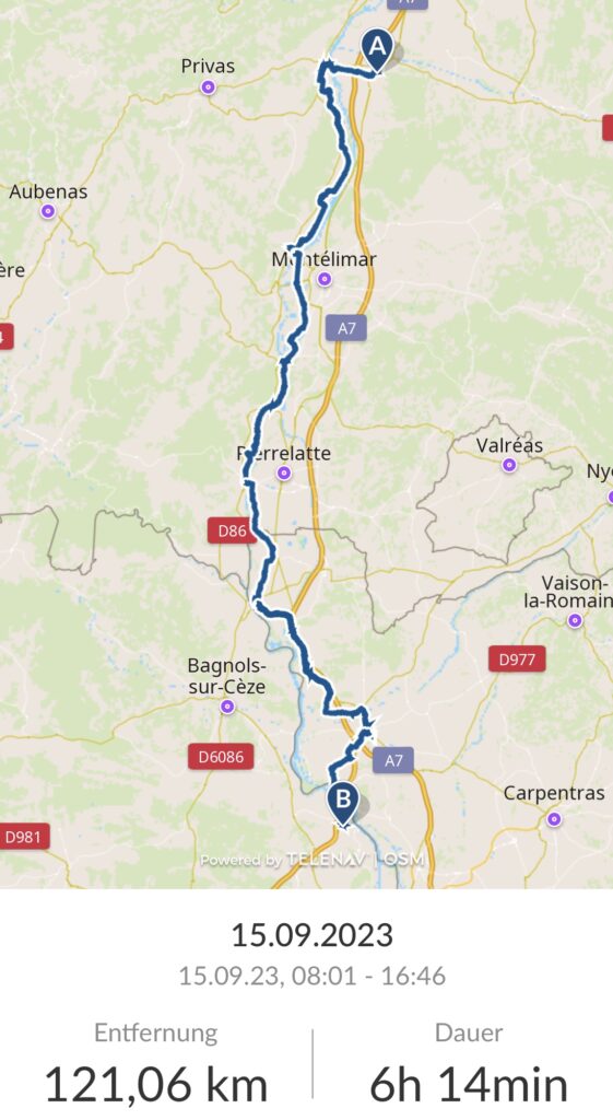 Tag 12 (15.9.) Loriol – Orange – Roquemaure / 121 km 15. September 2023 Michael Brueckmann Uncategorized Wir kommen weiter in den Süden: Die „Tür“ zur Toilette Der größte Teil für heute ist geschafft (106 km). Orange ist erreicht. Jetzt geht es noch ca. 15 km bis zur Unterkunft. Das musste sein…😉 Mal wieder lecker 😋