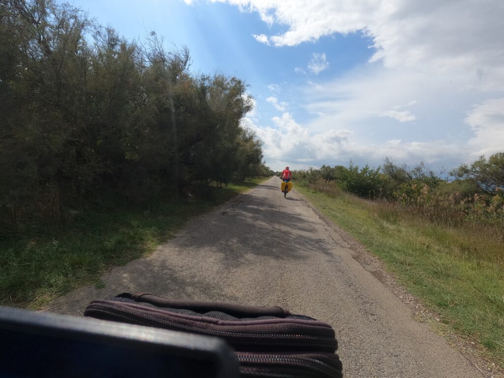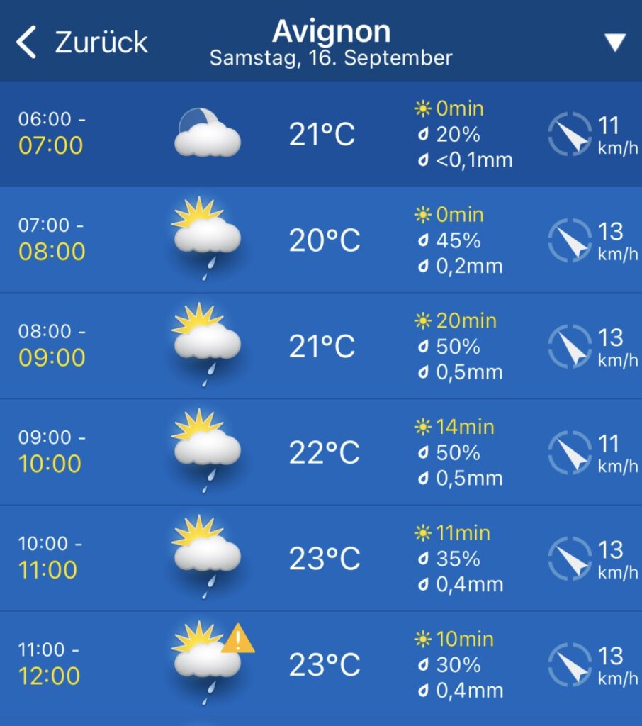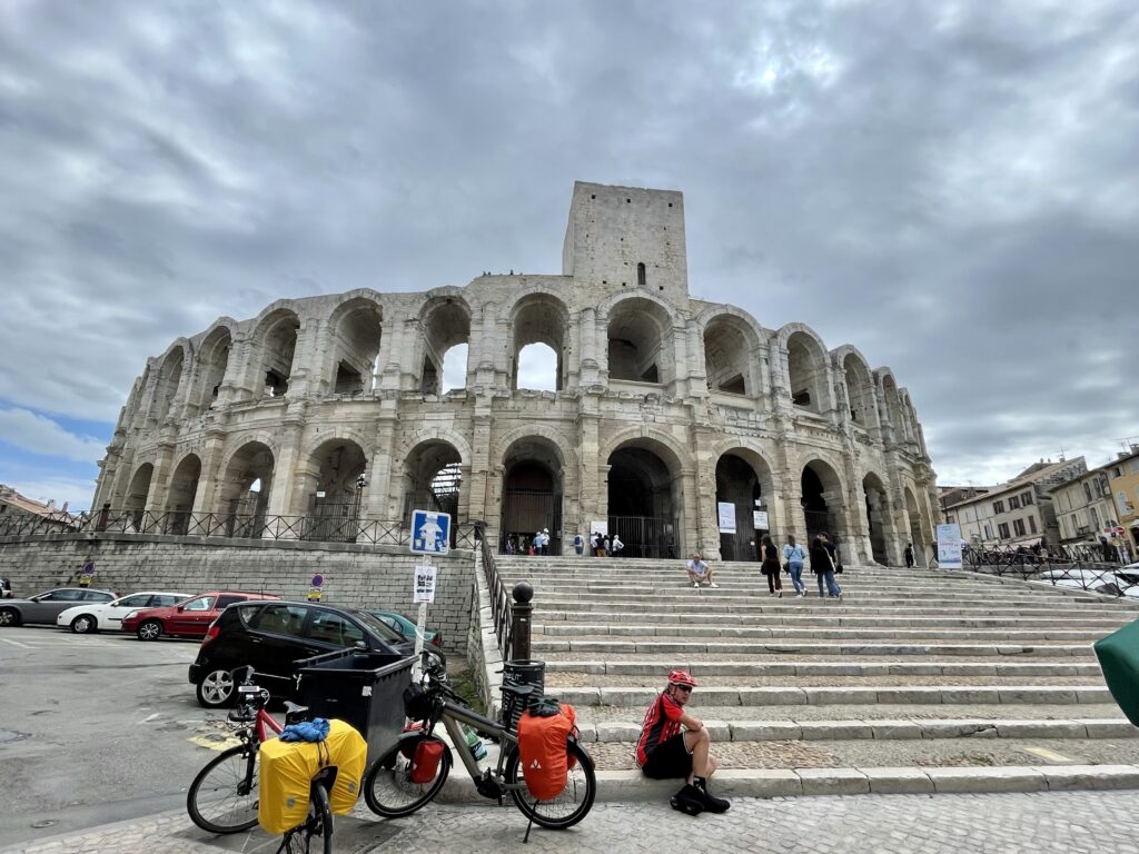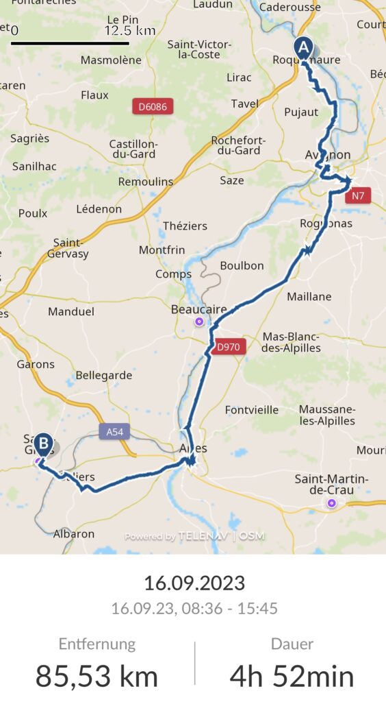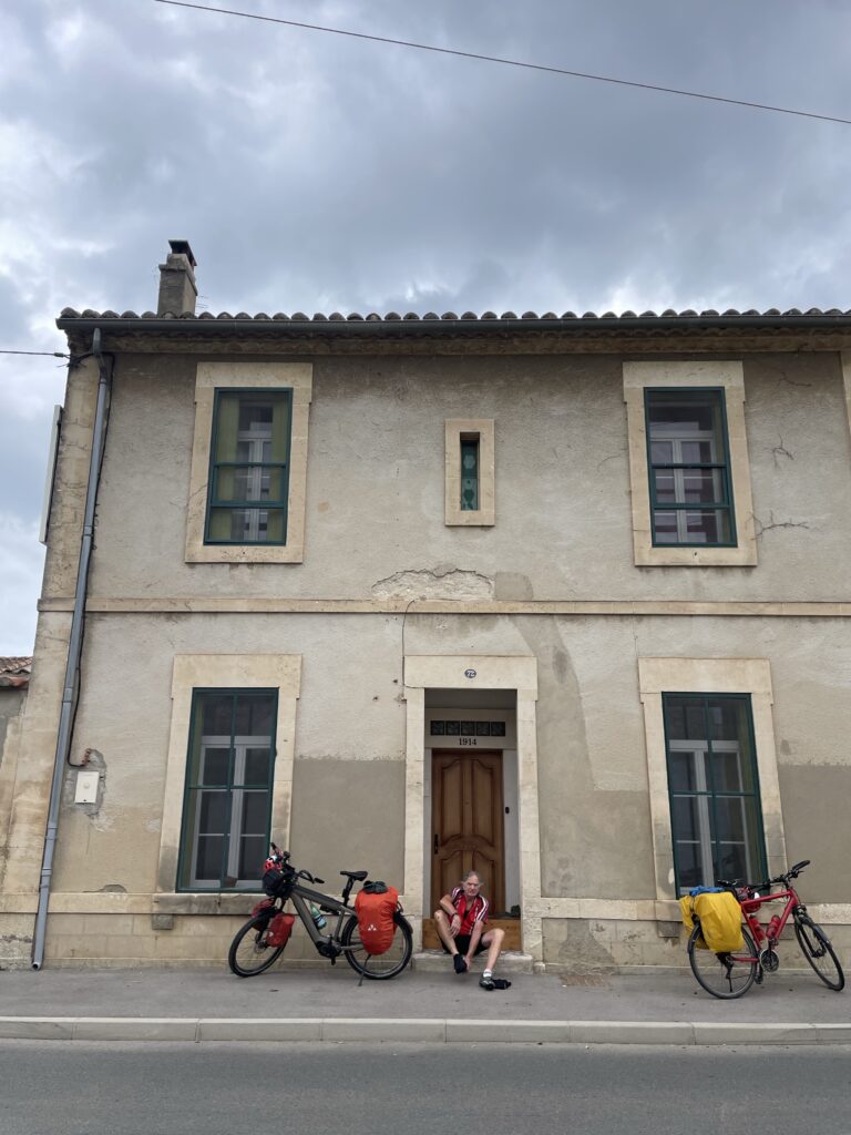 Angekommen… 🚴🏻♀️🚴🏻♀️👍🏼Abreise um 9:35 Uhr von unserem netten HotelStart im RegenFort Saint-André in Villeneuve-les-AvignonAvignonLe Pont…Avignon — eine sehr beeindruckende StadtDas bisher beeindruckendste Hotel de Ville Die OperPapstpalast — sehr imposantDans le Pont…Entlang der schier endlosen Stadtmauer von Avignon — das Verlassen der Stadt auf diversen Wegen hielt uns etwas auf und die Navigation funktionierte nicht immer zuverlässig.ArlesWohl zum letzten Mal die Rhone, unsere treue Begleiterin auf der Reise, genau wie vorher die Saône und die Mosel. Bis Dénia wird uns dann meist das Mittelmeer begleiten.Das sind wir wohl noch einmal um Dauerregen und Gewitter herumgekommen. Demnächst erwartet uns Saint-Gilles.Kennzeichen der Camargue, schwarze Stiere und weiße PferdeIn Saint-Gilles angekommen; der Vermieter ist nicht da……😩Pizza aus dem Wohnwagen, aber sehr !!! lecker!😋