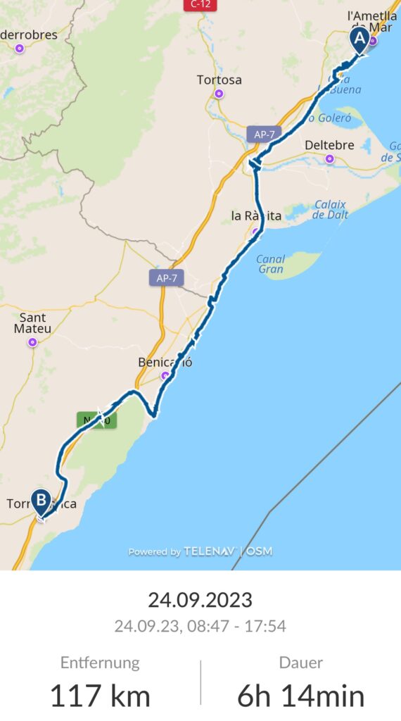 Nach etlichen Irrungen bei der anfänglichen Navigation sind wir dann doch nach 117 km in Torreblanca gut angekommen.
